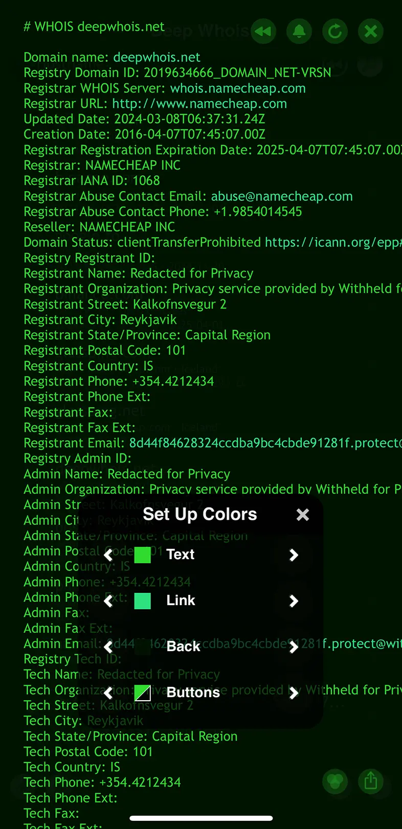Dans l’app Deep Whois pour iOS, vous pouvez facilement personnaliser les thèmes de couleurs Whois, soit depuis les réglages de l’app, soit directement depuis l’écran des résultats Whois.